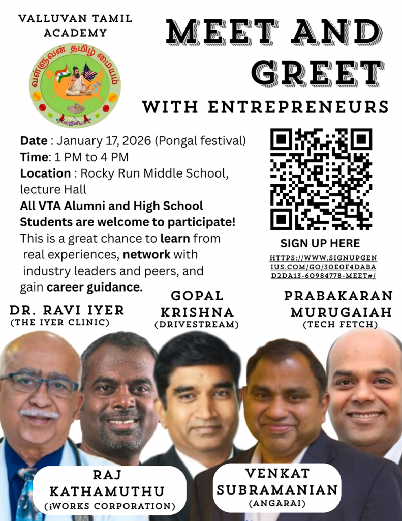 Speech/Debate, Thirukkural and Aathichoodi competitions registration is open. Last day to register – 02/06/2026. Competition is on 02/14/2026 at Rocky Run Middle School.