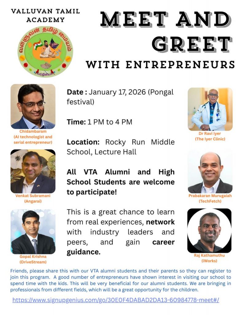 Speech/Debate, Thirukkural and Aathichoodi competitions registration is open. Last day to register – 02/06/2026. Competition is on 02/14/2026 at Rocky Run Middle School.