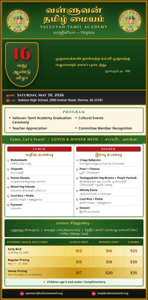 Valluvan Tamil Academy – 16th Annual Day celebration May 30th, 2026