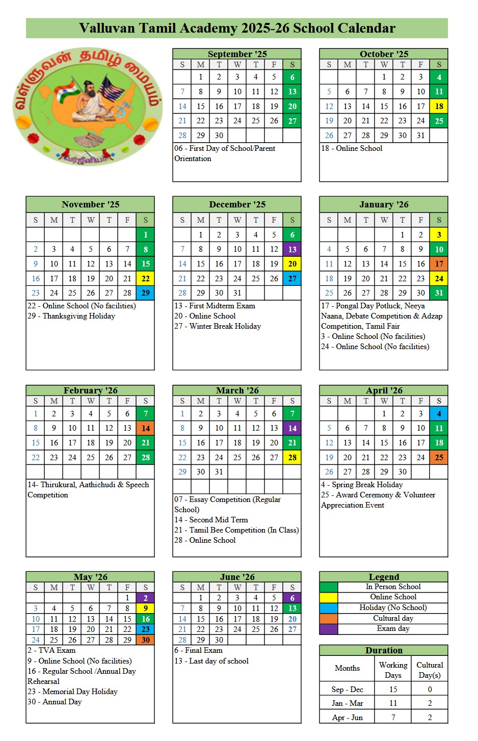 VTA Calendar academic year 2025-2026